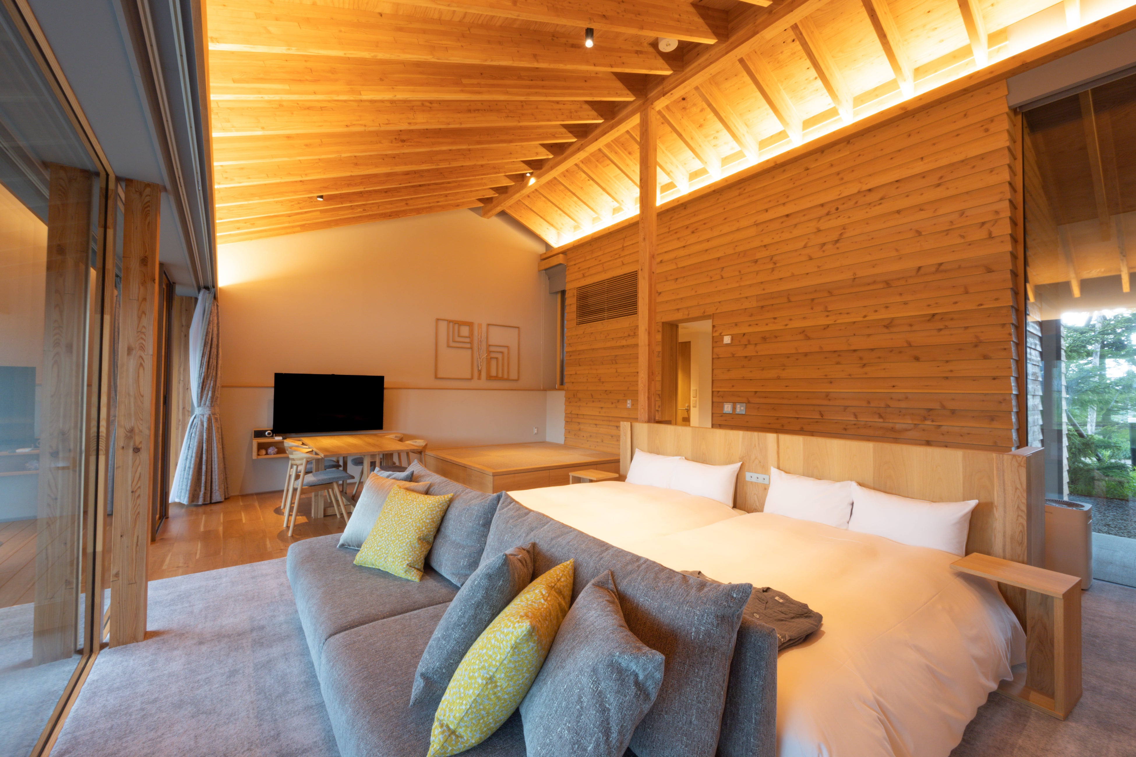 道産木材で建てられたスイート仕様の宿泊棟は、道産ブランドの旭川家具、北海道食材を愉しめる朝食と夕食、プライベートサウナ・水風呂・外気浴・ジェットバスを備えたバスルーム、良質な美容成分がふんだんに配合されたバスアメニティー「クロノシャルム」を全棟完備しており、お客様に五感で愉しんでいただけます。