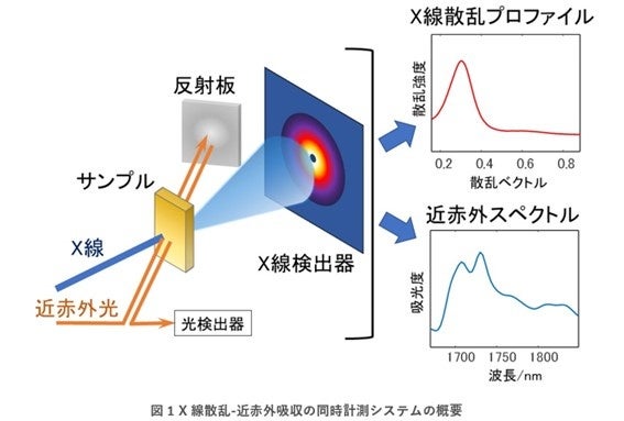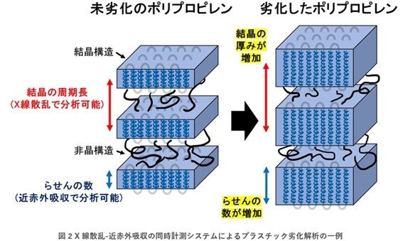 ・劣化による結晶の厚みの増加をX線で、高分子鎖のらせん形状の変化を近赤外光で検出