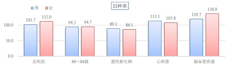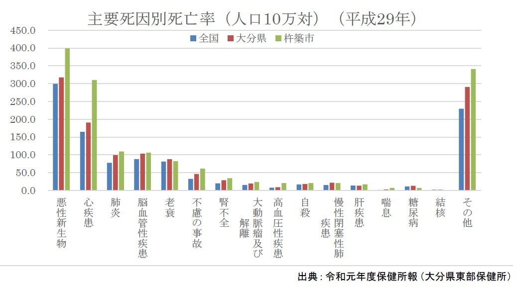 ・臼杵市は男性、女性とも循環器系疾患(心疾患及び脳血管疾患)による死亡が全国より多い。3)