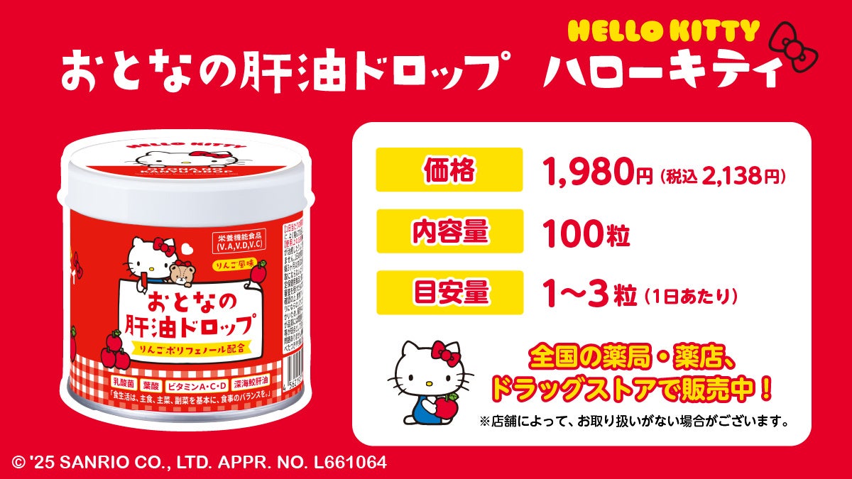 株式会社野口医学研究所(本社:東京都港区虎ノ門1-12-9、代表取締役社長:堤 大造)は、人気シリーズ「おとなの肝油ドロップ」より、株式会社サンリオの人気キャラクター「ハローキティ」とコラボレーションした新商品『おとなの肝油ドロップ ハローキティ』を、2025年7月7日(月)より全国の薬局・薬店、ドラッグストアにて数量・期間限定で発売いたします。