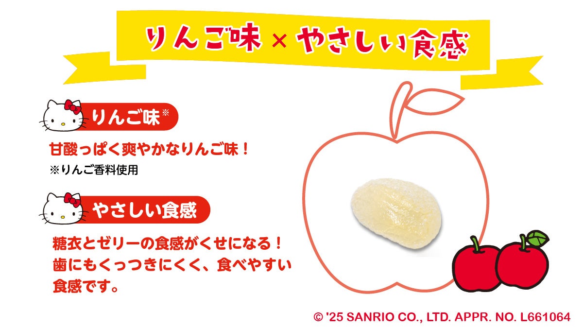 歯にくっつきにくく、ほどよい弾力で噛みやすい“やさしい食感”にこだわりました。ゼリーのような口あたりと、外側の糖衣が生み出すサクッとしたアクセントが、噛むたびに心地よい楽しさをもたらします。味は、ハローキティとゆかりの深い“りんご味”。甘酸っぱく爽やかな風味で、子供から大人まで毎日食べたくなるおいしさをご提供します。