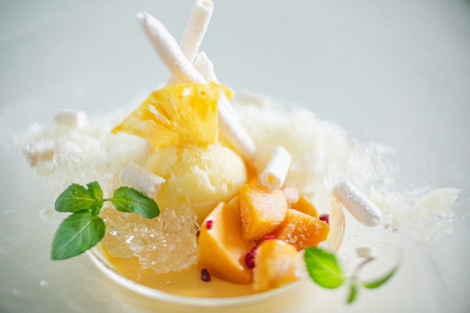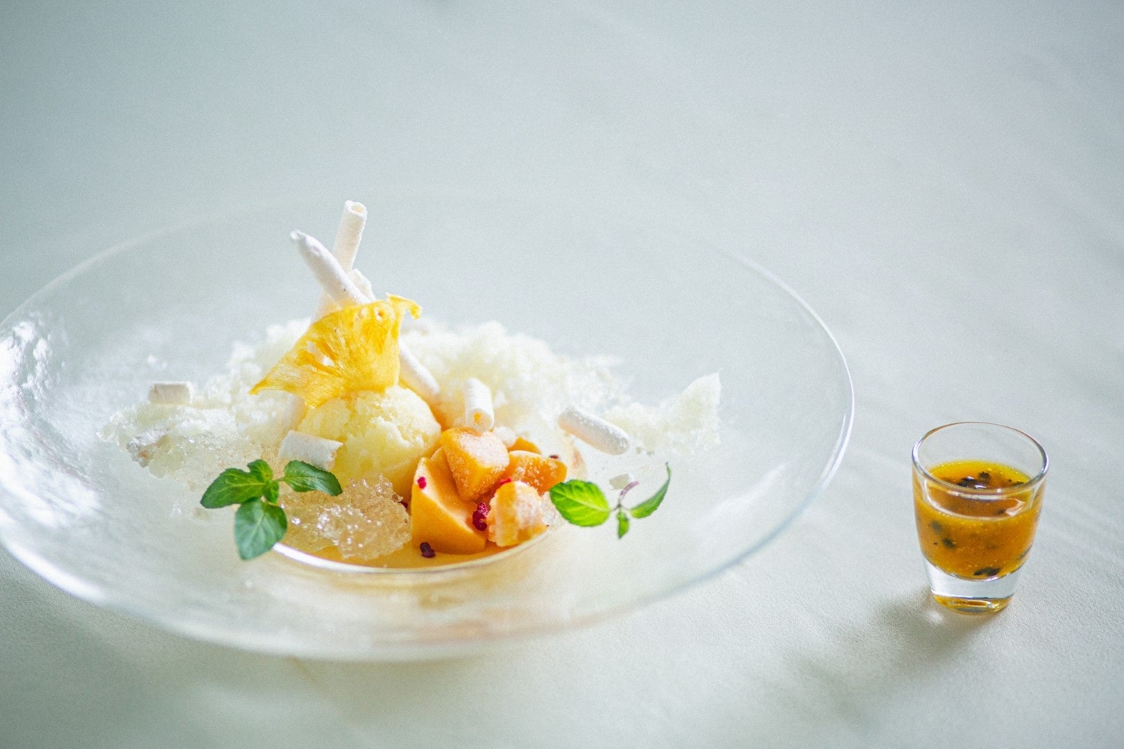 舌触りが心地よいマンゴープリンに、シャリシャリのフローズンマンゴー、クラッシュレモンゼリー、爽やかな酸味のグレープフルーツかき氷をトッピングしました。