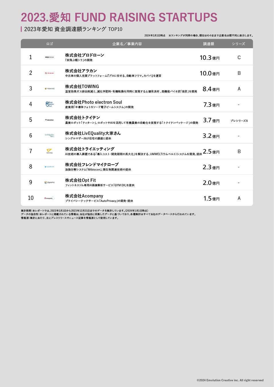 本レポートでは、愛知県内に本社があり、調達額を発表しているスタートアップの資金調達額TOP10をまとめています。