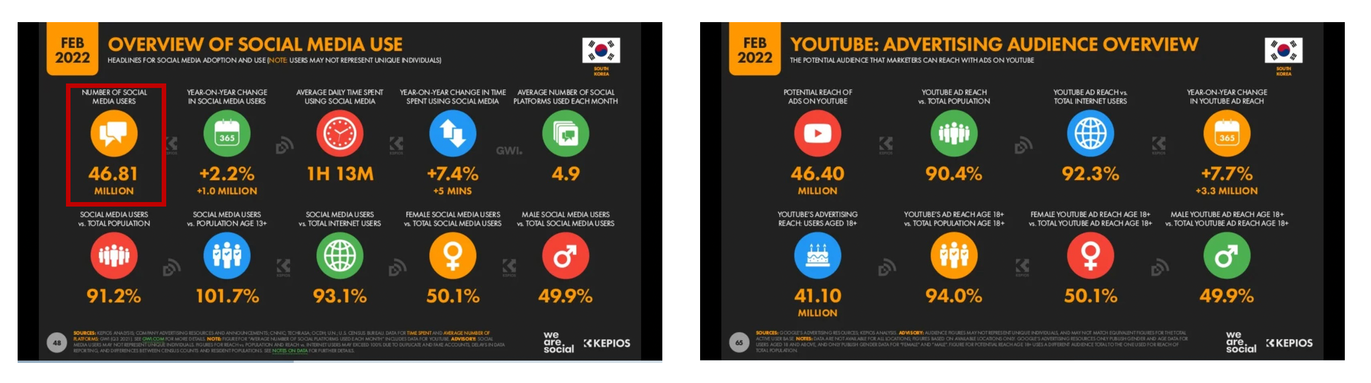 韓国のSNSユーザーは2022年初頭で全人口の90%を超える利用率となっており、SNSが日常の必需品となっている状況。