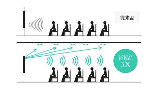 本体上部に配置されたスピーカーは、天井の反射を利用して同じ音声出力でもより遠くまで音を届けることができます。また、マイクの数を増やし、集音声が大きく向上し、教室の雑音を低減しながら発言者の音声をしっかりと集音できます。