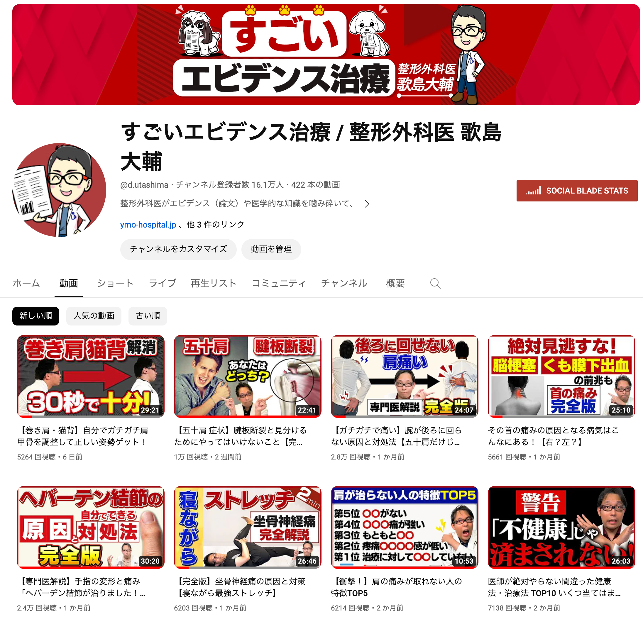 「すごいエビデンス治療 | 整形外科医 歌島大輔」は、健康・医療情報を学び実践するための現役医師によるYouTubeチャンネルです。現時点でチャンネル登録者数は16万人を越えて、今現在も伸び続けています。整形外科医が運営するYouTubeチャンネルとしては最大手というポジションを確立しております。