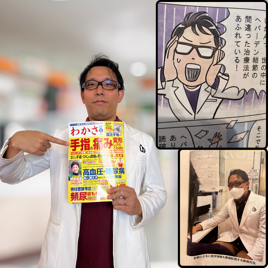 整形外科専門医の歌島大輔が運営するYouTubeチャンネル「すごいエビデンス治療 | 整形外科医 歌島大輔」において220万回を越える再生数を記録する動画「【医師解説】ヘバーデン結節の治療方法TOP3【指の痛み・第一関節】」があります。今回、取材いただいたのも、これらのヘバーデン結節関連の動画を雑誌「わかさ」編集部の方にご覧いただいたことがきっかけです。