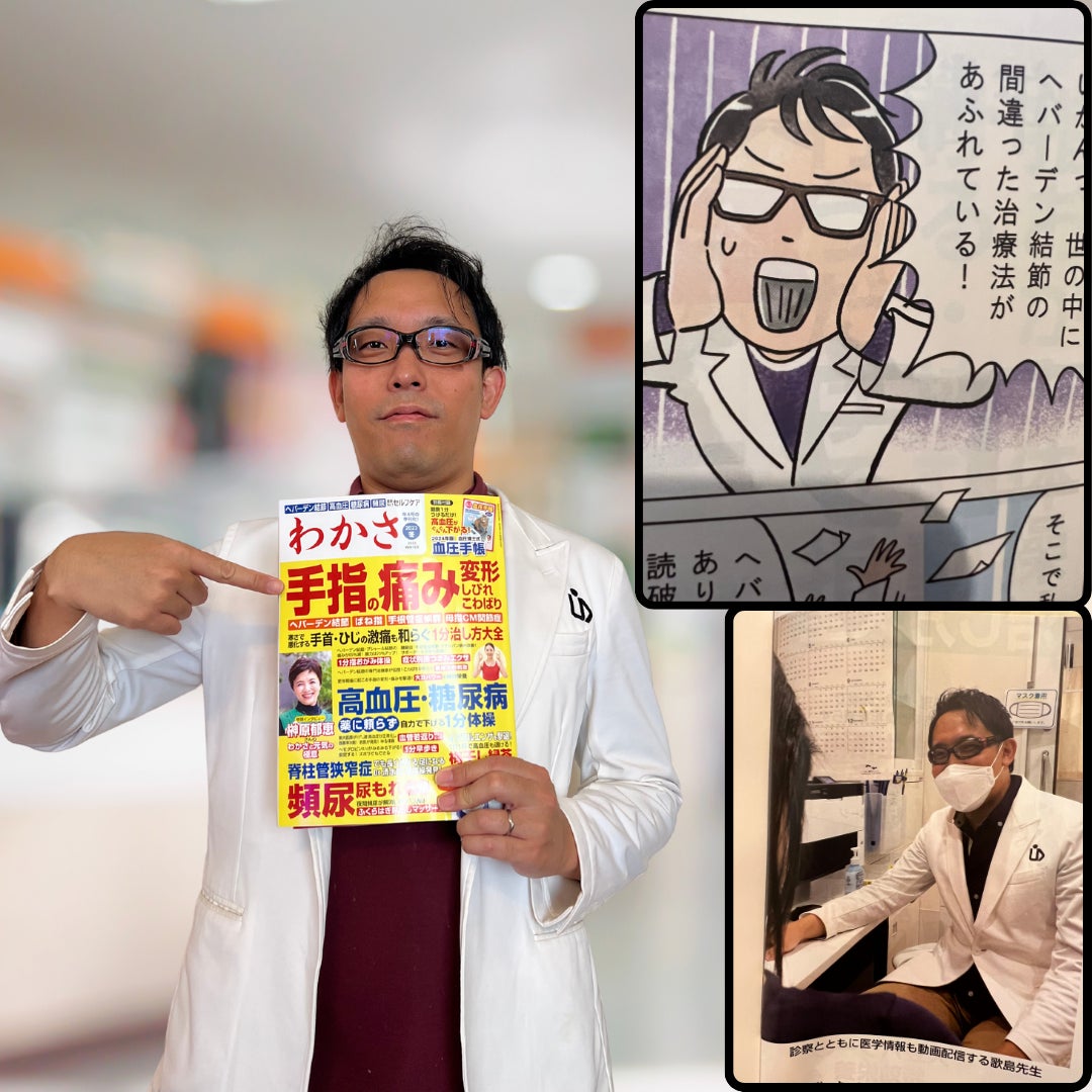 整形外科医 歌島大輔が、健康寿命を延ばす新しい生き方を提案する雑誌「わかさ2023年冬号」に掲載されました。記事はゆらぎ期以降の女性に多い指の痛み、変形の原因であるヘバーデン結節に関する医学的根拠を元にした情報になります。具体的な「指おがみ体操」も写真付きで丁寧に紹介していただいております。歌島は今後も「わかりやすさ」と「医学的根拠あり」を重視した情報発信を、YouTubeを含む様々な媒体で展開していきます。