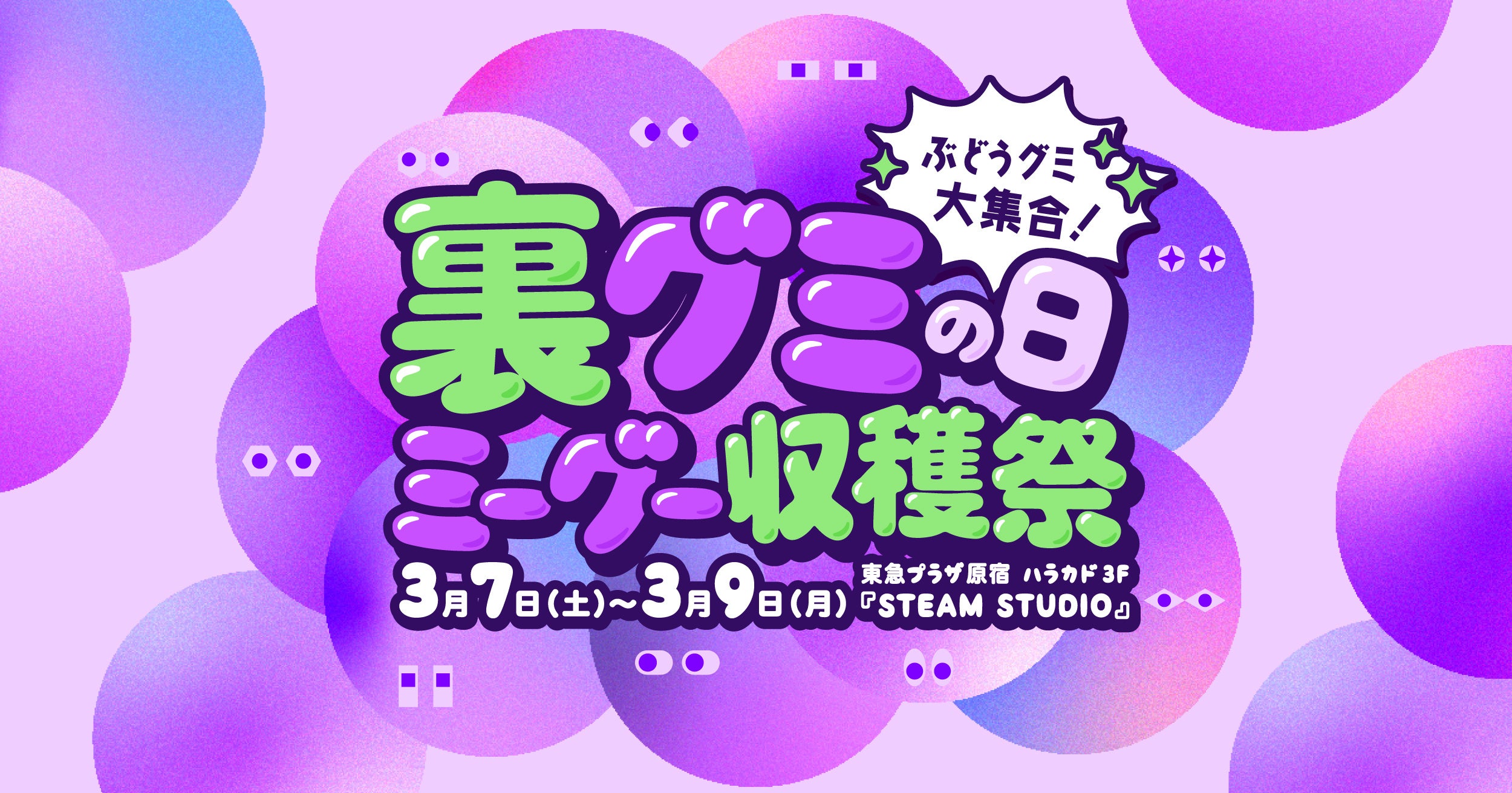 裏グミの日としては初のイベント「裏グミの日!ミーグー収穫祭!」を3月7日(土)~3月9日(月)までの3日間、「東急プラザ原宿 ハラカド3F『STEAM STUDIO』」で開催いたします。