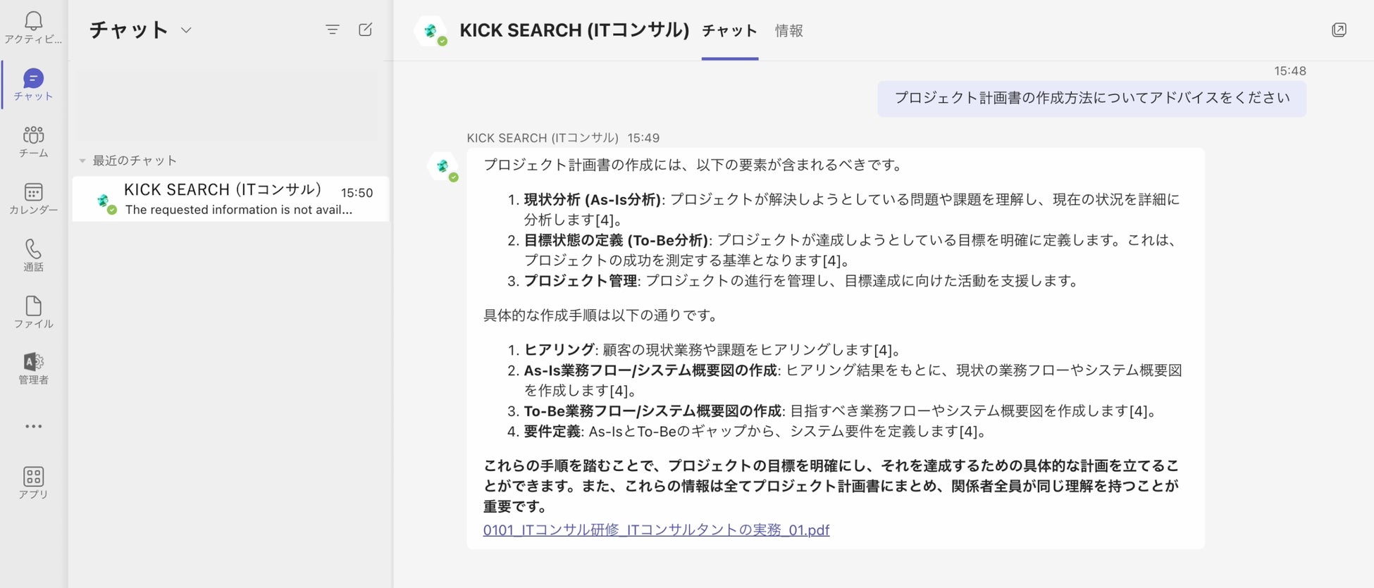 KICK SEARCHではあえて独自のチャット画面を設けておらず、お客様にて普段お使いのチャットツールに組み込む形での構築を提案しています。そうすることで、わざわざKICK SEARCHを利用するためにWebサービスを立ち上げログインする必要がなく、あたかも同僚にチャットをするようなユーザー体験で社内のナレッジ検索を可能にし、社内定着率の向上に貢献しています。