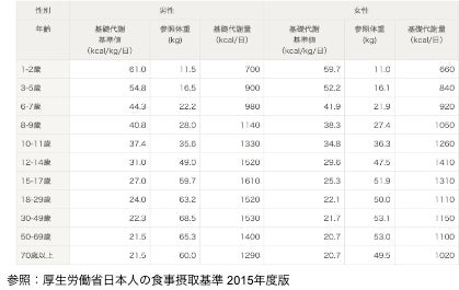 基礎代謝が年齢と共にどれくらい減少してくるかは、厚生労働省から発表されている下記表をご参照ください。こちらの表からわかることは、男性は15-17歳、女性は12-14歳をピークに年齢と共に基礎代謝が徐々に減少してきます。