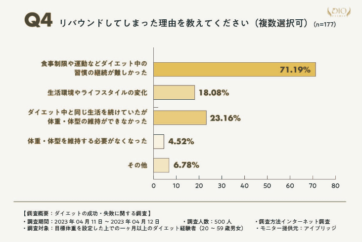 リバウンドの理由で多く寄せられたご意見として、7割強の方が「食事制限や運動などダイエット中の習慣の継続が難しかった」とお答え頂いております。