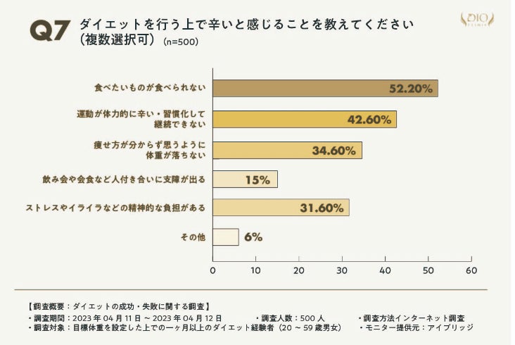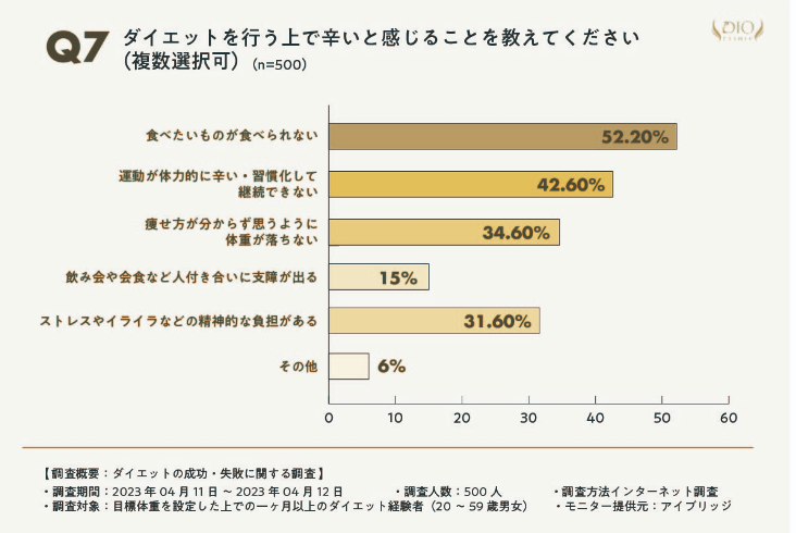 500名中、「食べたい物が食べられない」と回答した方が52.20%で過半数を占めている。しかし運動の習慣化ができないことや、思うように体重が落ちないことも辛い点として挙げており、ダイエットの辛さは満遍なく感じている。