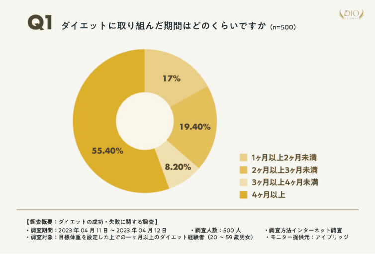 そこで医療ダイエット専門のディオクリニックが、「目標体重を設定して1ヶ月以上本気でダイエットに取り組んだ経験がある人」を対象に、一般的なダイエットの結果等に関するアンケートを実施しました。