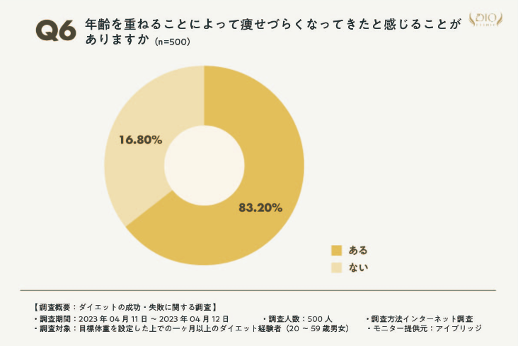 500名のうち年齢を重ねるに連れて痩せづらくなっていると、83.2%が回答。20代も「ある」と回答した人が78.1%となり、どの年代でもほとんどの人が感じている。