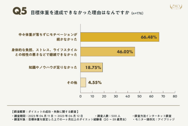 ダイエットに失敗してしまったグループが目標体重を達成できなかった理由として、「体重が落ちずにモチベーションが続かなかった」が66.67%、「身体的な負担、ストレス、ライフスタイルとの相性の悪さなどで継続できなかった」が45.98%。多くの方が同じような理由で失敗していることが明らかになった。
