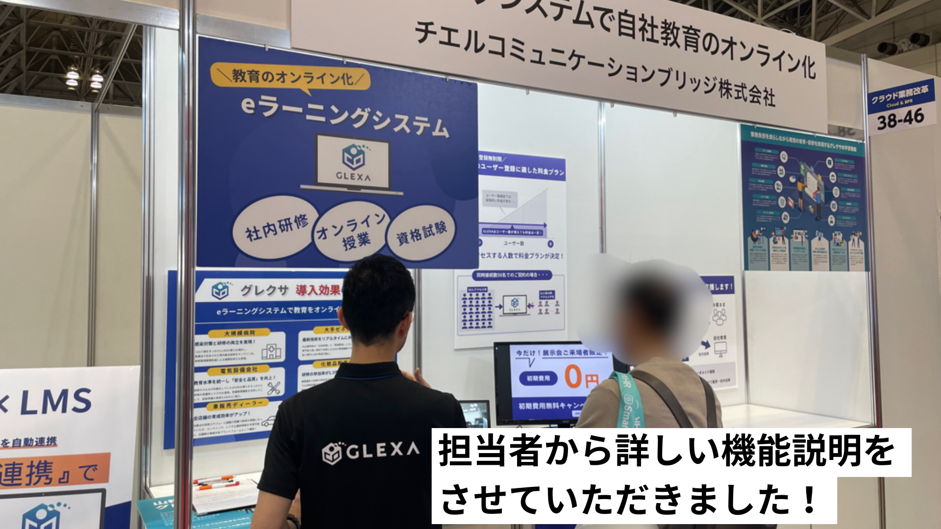 弊社ブースではeラーニングシステム「GLEXA(グレクサ)for エンタープライズ / https://glexa.jp/」の機能や現場での活用方法などを担当者が実演デモを交えて詳しくご紹介させていただきました。