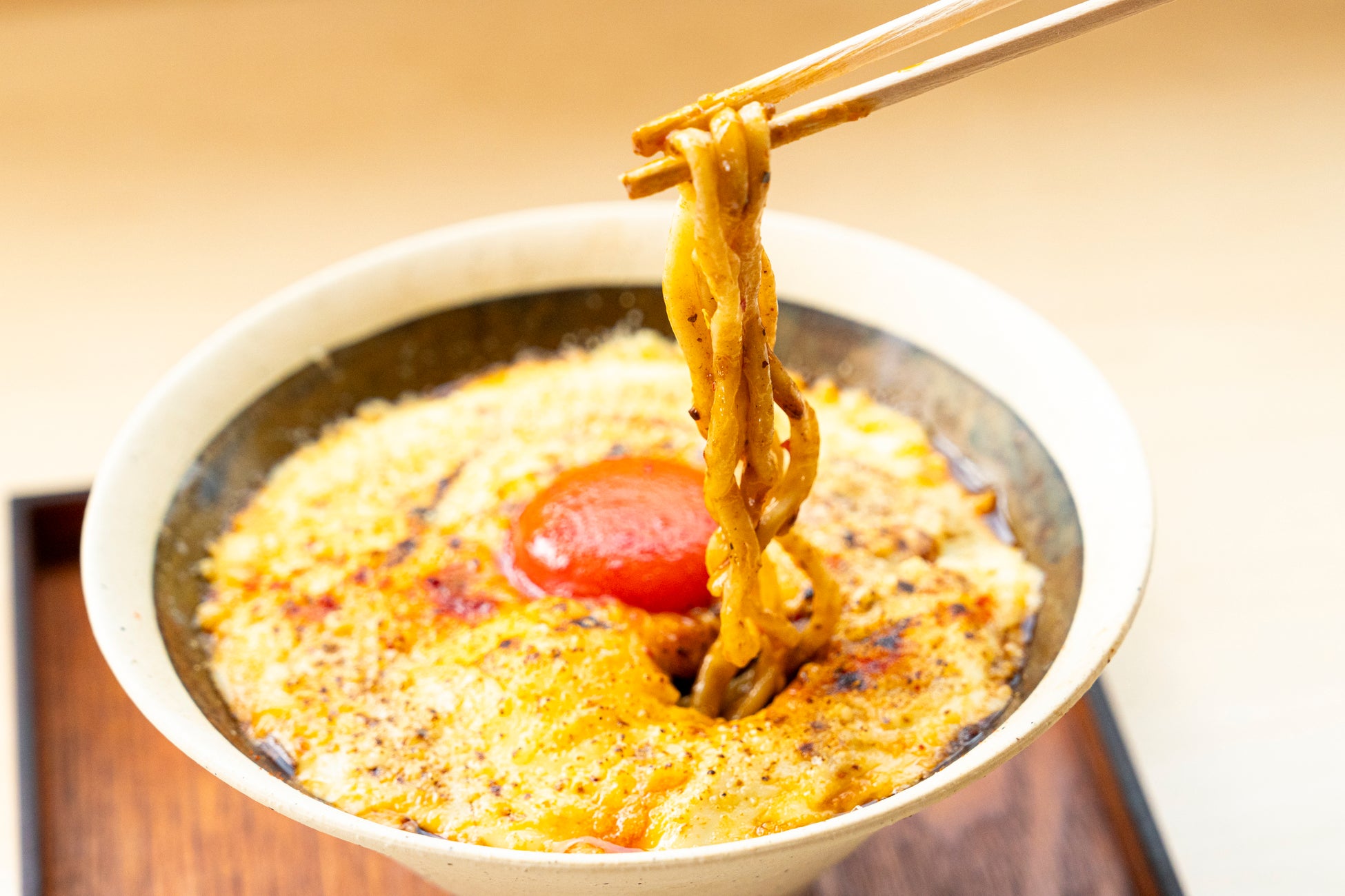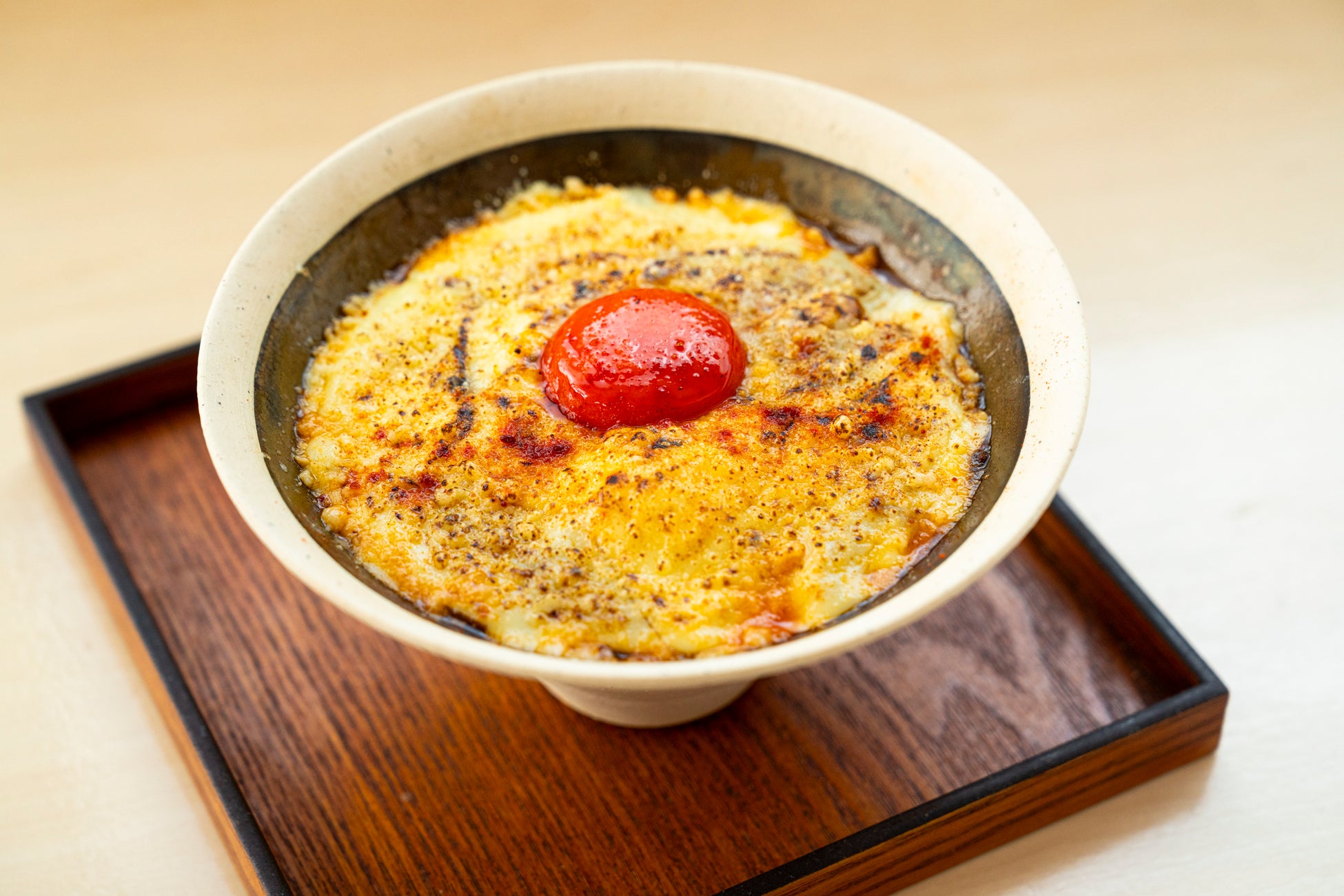 麻婆ソースと濃厚なチーズが絶妙に融合した、コクのある一品です。特製麻婆が熱々のラーメンに絡み合い、食欲をそそります。炙ったチーズと卵黄の相性が抜群で、食べるたびに濃厚な旨味が口いっぱいに広がります。
