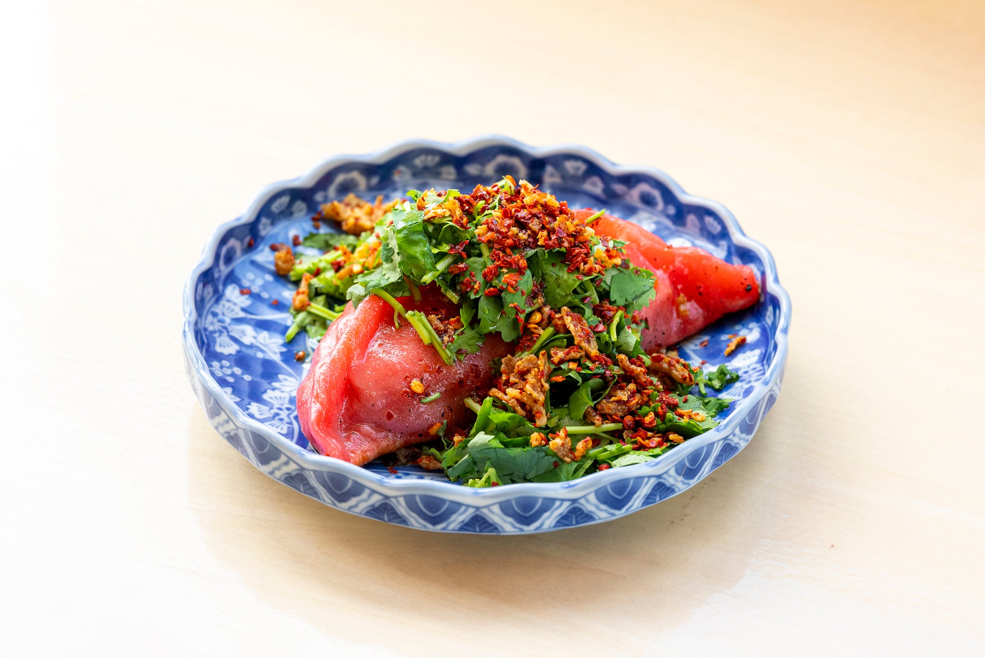 「ぷりぷり丸ごとエビ餃子(自家製)」¥680 「ピリ辛パクチー餃子(自家製)」¥800