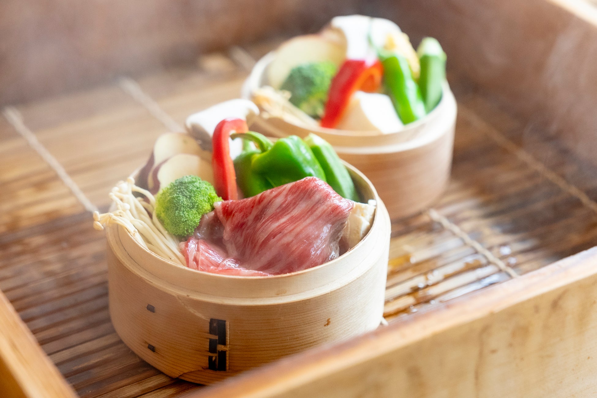 「和牛ロースと夏野菜のセイロ蒸し」(¥1,450)は、厳選された和牛ロースを使用。彩り鮮やかな新鮮な夏野菜とともに蒸しあげます。柔らかい和牛と瑞々しい野菜をお楽しみいただけます。