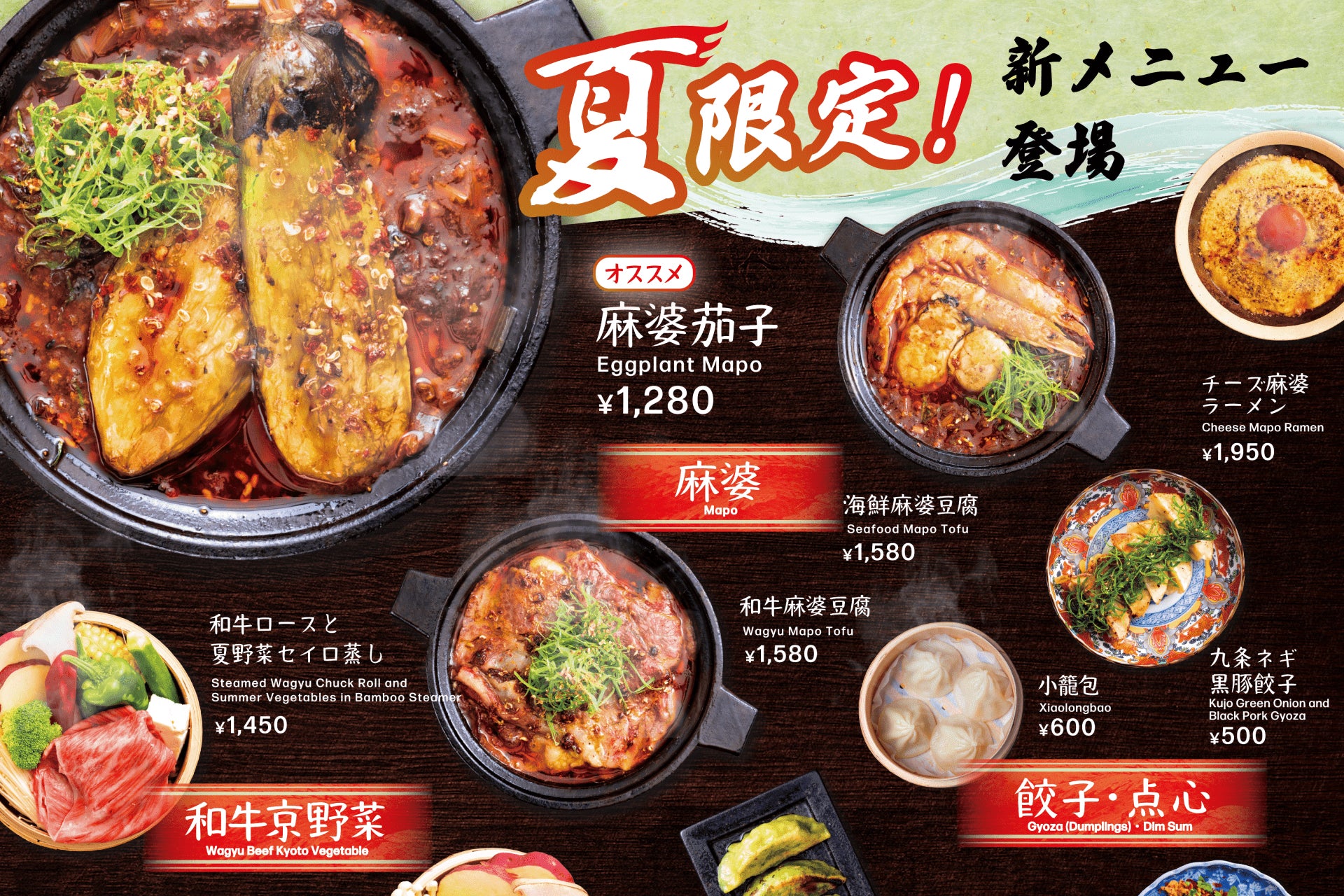 京豆腐をはじめとした、京都ならではの夏の食材を心ゆくまでお楽しみいただける新商品をご用意いたしました。広々とした席で、海鮮や夏野菜をふんだんに使った麻婆やセイロ蒸し料理を、ぜひご堪能ください。
