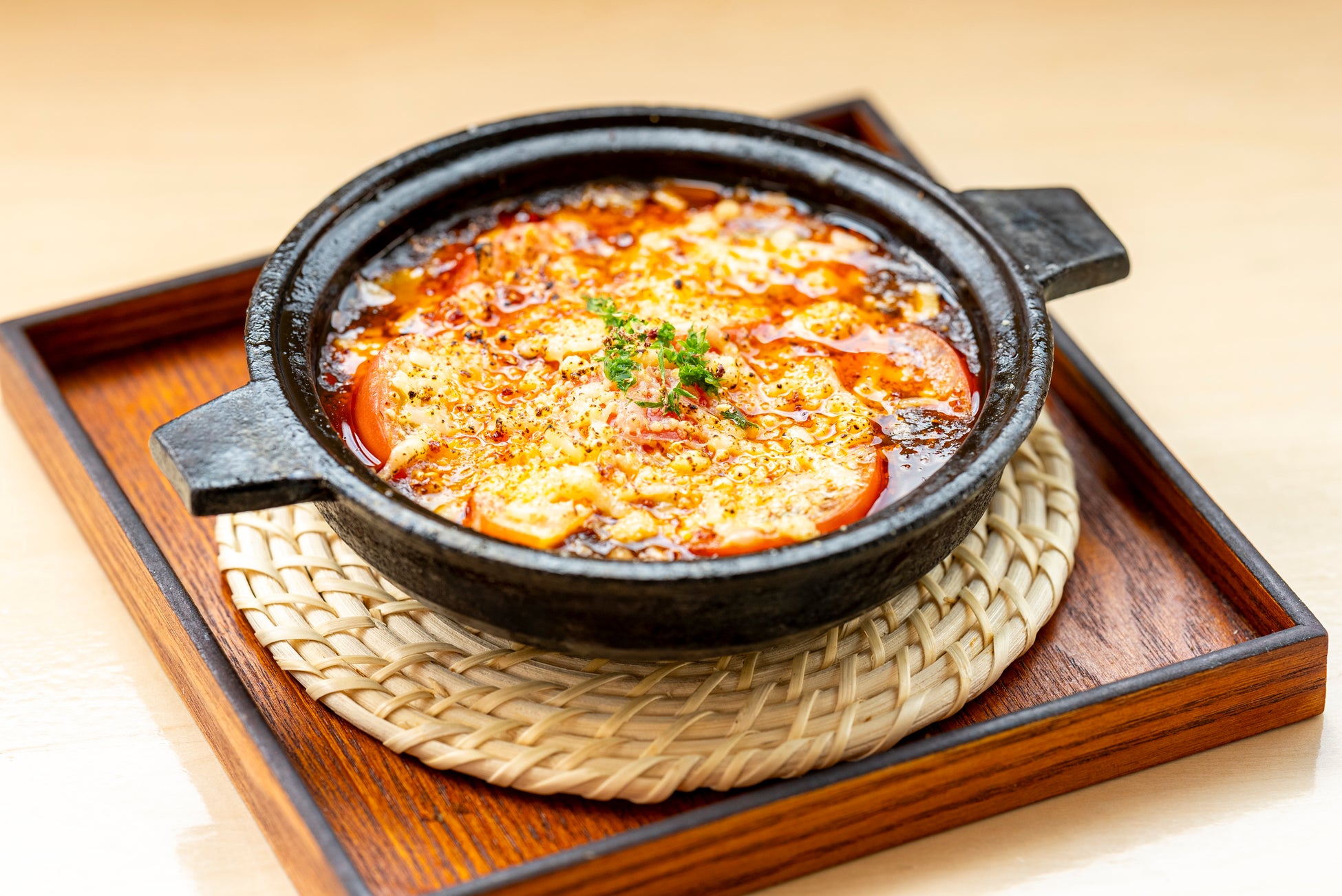 フレッシュなトマトと濃厚なチーズ、特製麻婆の相性抜群な一品です。トマトのジューシーさとチーズのクリーミーさが際立つ味わいとなっています。