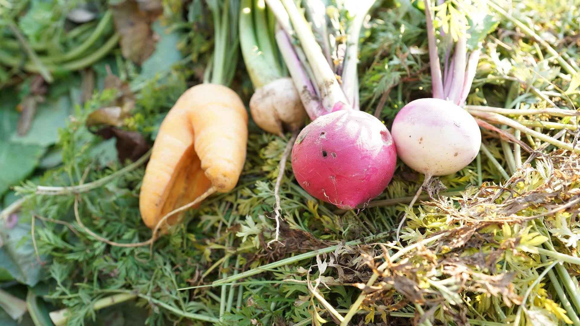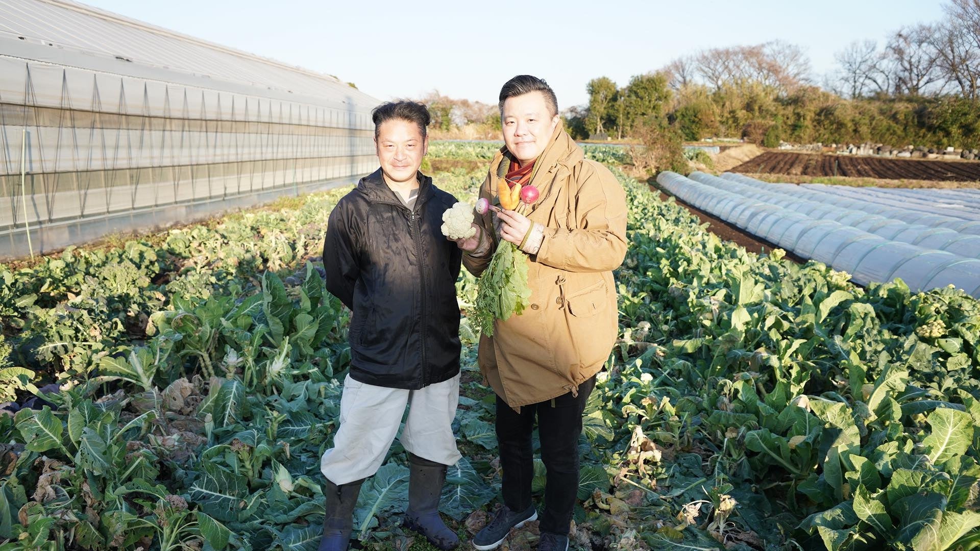 (写真:形の整わない鎌倉野菜. 福ちゃん農園鎌倉野菜 福田氏と当社 代表取締役社長 須田哲崇)