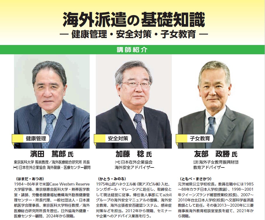 公益財団法人 海外子女教育振興財団と一般社団法人 日本在外企業協会は、国内の企業・団体の海外人事担当者を対象にしたオンラインセミナーを共同開催し、社員・職員を海外赴任させる上で知っておきたい海外での「健康管理」「安全対策」「子女教育」について、それぞれのエキスパートが分かりやすく解説します。