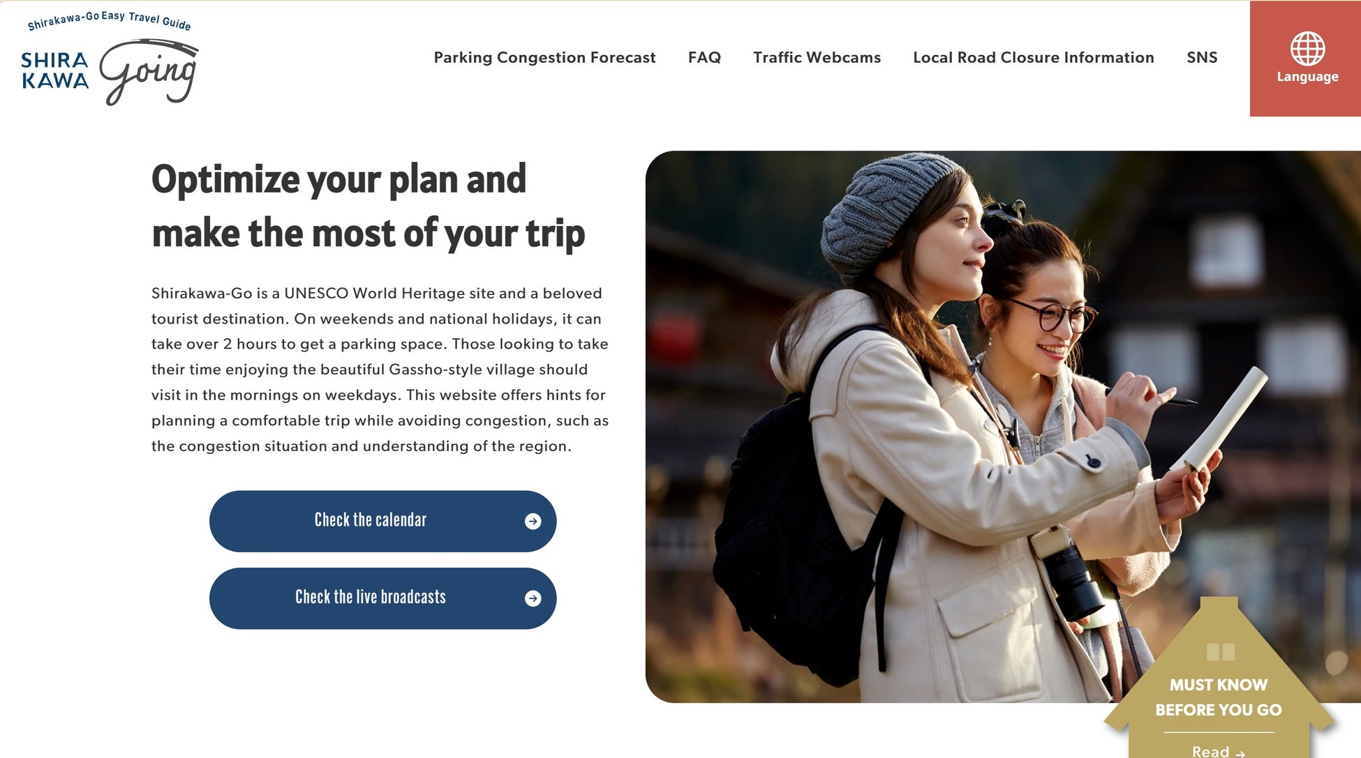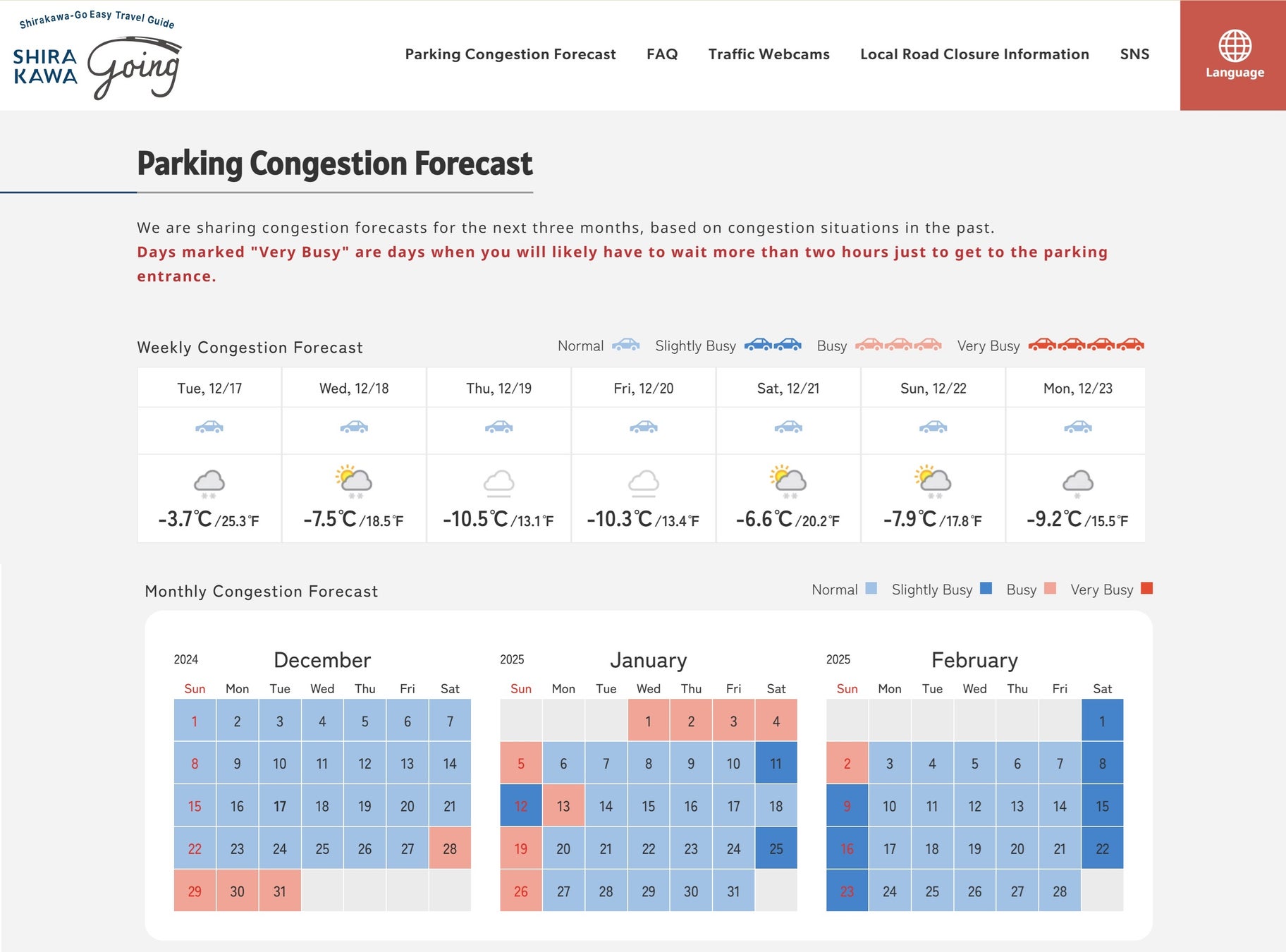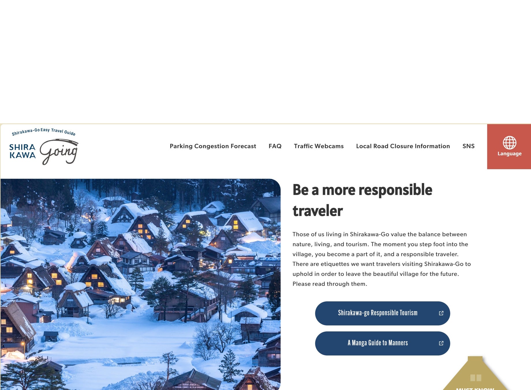 このようなことから、「白川郷すんなり旅ガイド シラカワ・ゴーイング(SHIRAKAWA-Going)」多言語版サイトでは、渋滞を避けるための情報に加え、レスポンシブル・ツーリズムへの理解促進、外国人観光客からの問合せが多い基本情報として、駐車場情報・季節の服装の他、特に白川村の観光入込のTOP5を占める東南アジアの観光客には馴染みのない冬用タイヤの装着などの安全に関する情報も発信しています。