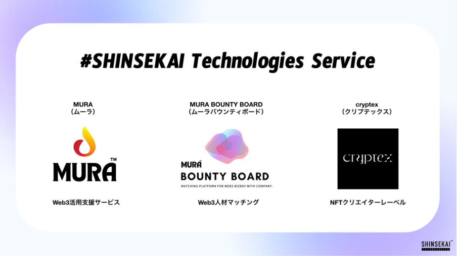 株式会社SHINSEKAI Technologiesは「Web2.X SHIFT」をミッションに、企業やサービスのWeb3進出支援を行う会社です。「NFT制作」「コミュニティ運営」「独自ウォレット」「Web3人材支援」などをワンストップで提供するサービス「MURA」を運営しています。また国内最大級の分散型Web3人材ネットワーク「新世界DAO」を通じて、Web3進出に挑戦する個人をエンパワーしています。私たちはWeb3経済圏のマスアダプションに向けて、様々な課題を解決します。