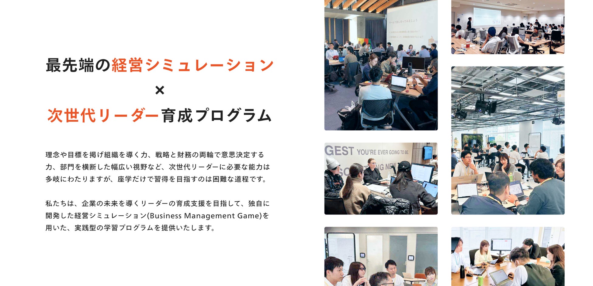 私たちは日本の未来を明るくするため、次世代リーダーの育成を支援しております。自社で開発した経営シミュレーションを用いて、法人企業や高等教育機関において楽しく、実践的で、行動変容に繋がる学習機会を提供し、よりよいビジネス、組織、キャリアとなることを支援いたします。