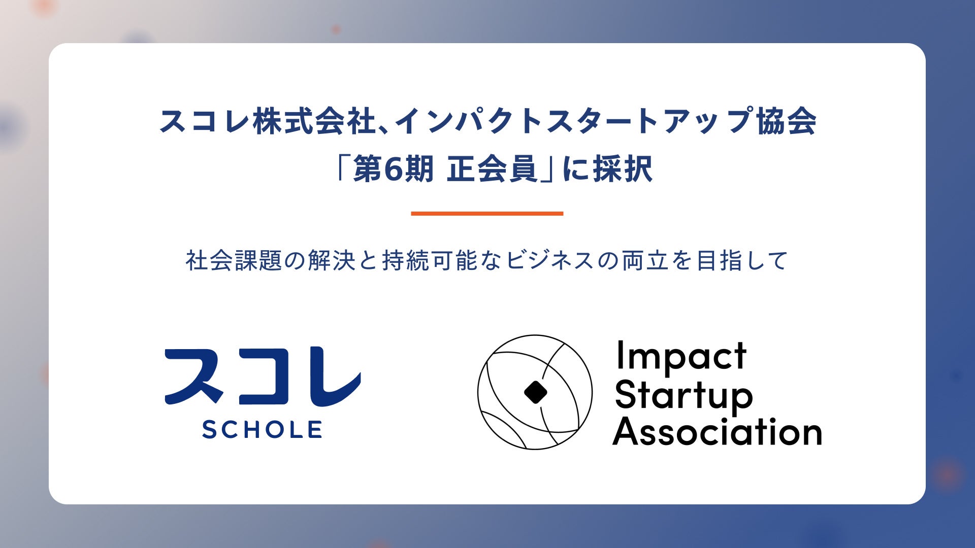 スコレ株式会社(本社:東京都新宿区、代表取締役:須藤 奨、以下「スコレ」)は、一般社団法人インパクトスタートアップ協会が実施する「第6期 正会員」に採択されましたことをお知らせいたします。 インパクトスタートアップ協会は、社会課題の解決と持続可能なビジネスの両立を目指すスタートアップを支援する国内有数のエコシステムです。このたびの採択を通じて、当社は志を同じくする仲間とともに、より一層インパクトのある挑戦に取り組んでまいります。
