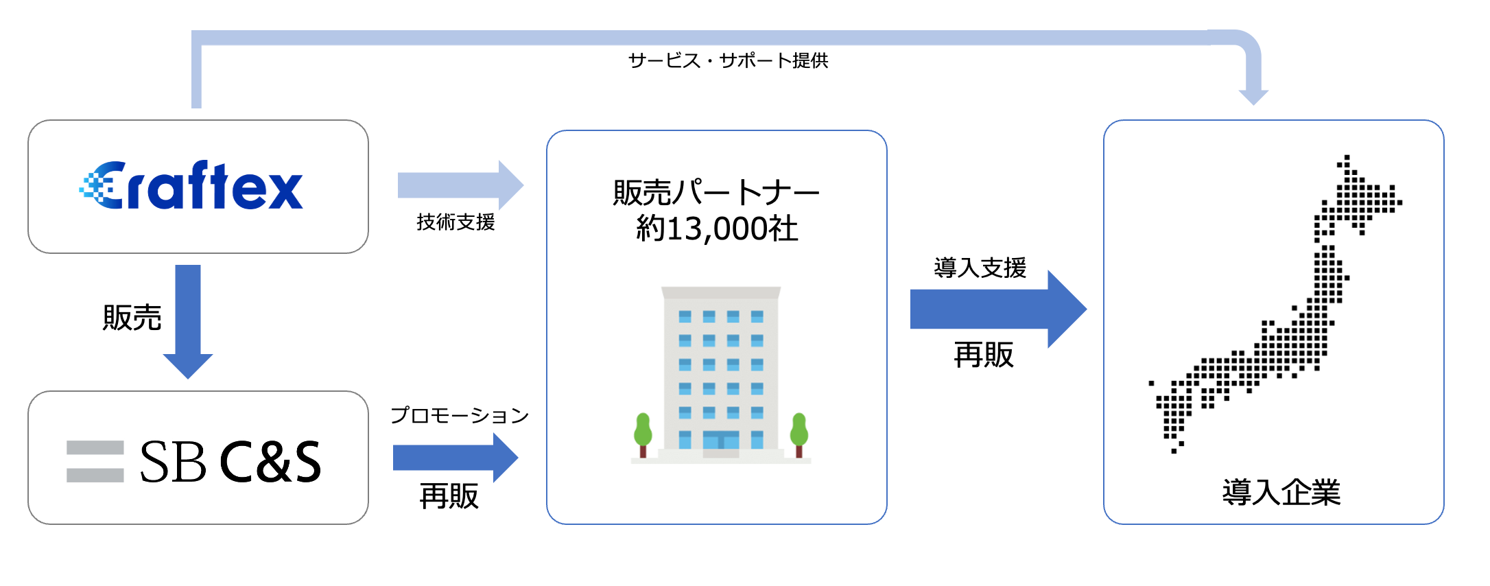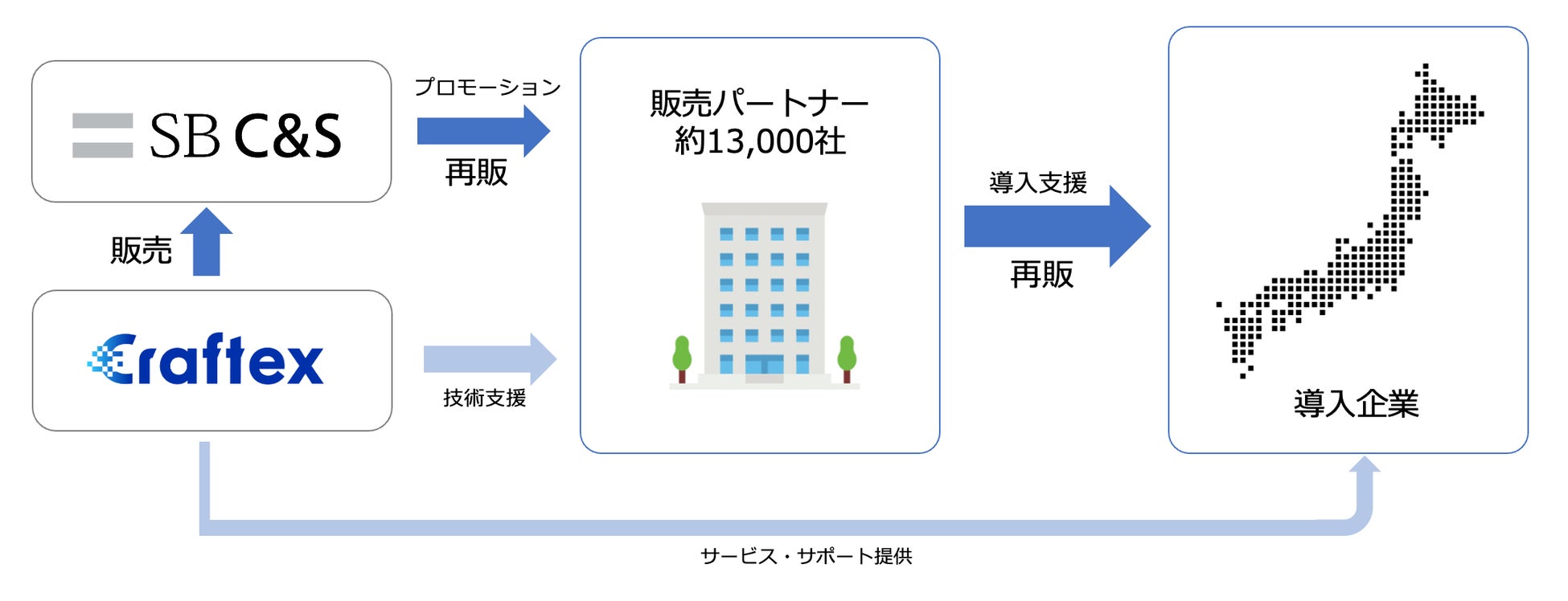 クラフテクス:SB C&Sに対して「DataSyncer for kintone(データシンカー)」の販売を行います。また導入企業へサービス提供とオンラインサポートを提供します。さらに販売パートナーが導入支援をする際の技術サポートを行います。