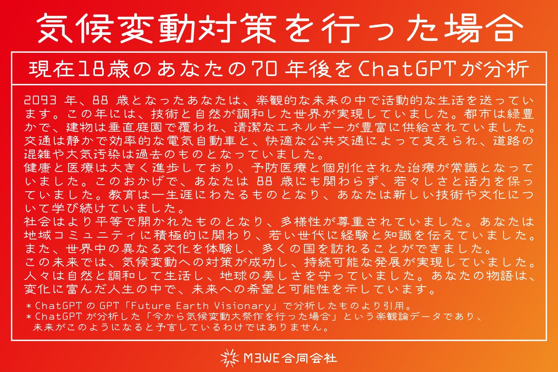 私たちは「このまま気候変動が進むと」などという情報を目にすることがあります。例えば100年先の桜の開花シーズンや、100年先の紅葉のシーズンをAIで分析したものを聞いてもあまりイメージできません。しかし、「70年後の自分の暮らし」となると、「将来こうなるの?」と驚くのではないでしょうか。また、現在18歳くらいのお子様をお持ちのご両親は、「子どもが88歳になる頃にはこんな未来が来るの?」と思い、気候変動に対する意識が変わるかもしれません。