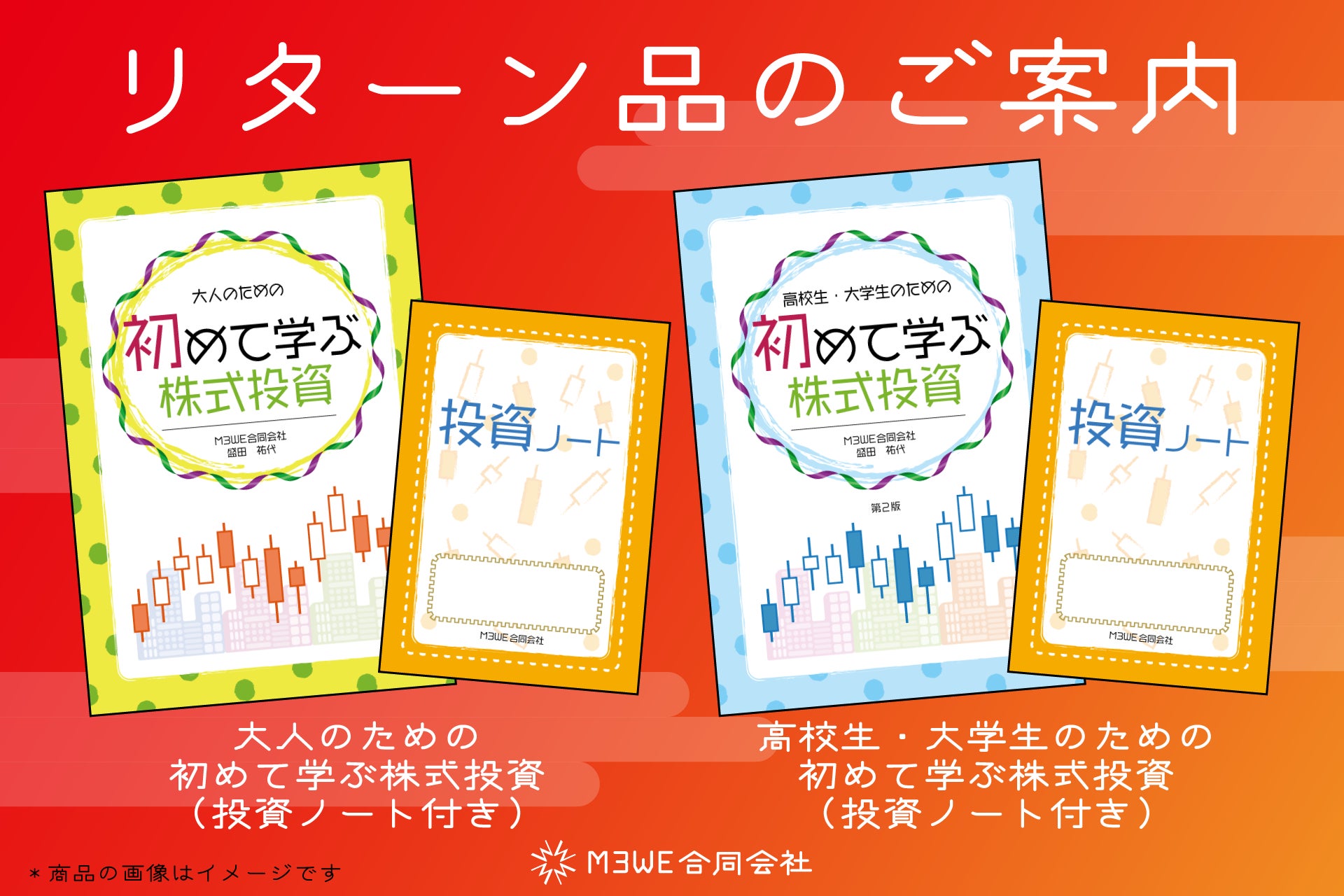 <初めて学ぶ株式投資 親子セット> 限定1,000個 7,800円(税送料込) <初めて学ぶ株式投資 大人用> 限定1,000個 3,900円(税送料込) <初めて学ぶ株式投資 高校生・大学生用> 限定1,000個 3,900円(税送料込) |