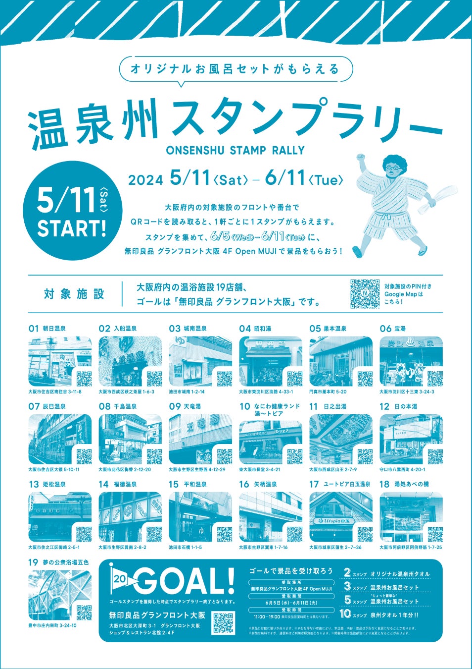 大阪府内19箇所の温浴施設のお風呂でスタンプを獲得、梅田の「無印良品 グランフロント大阪」をゴールに設定した温泉州スタンプラリーを実施します。温浴施設入り口の温泉州タオル製のれんを目印に、それぞれに特徴のあるお風呂をめぐり、ゆったりとした時間をお楽しみください。