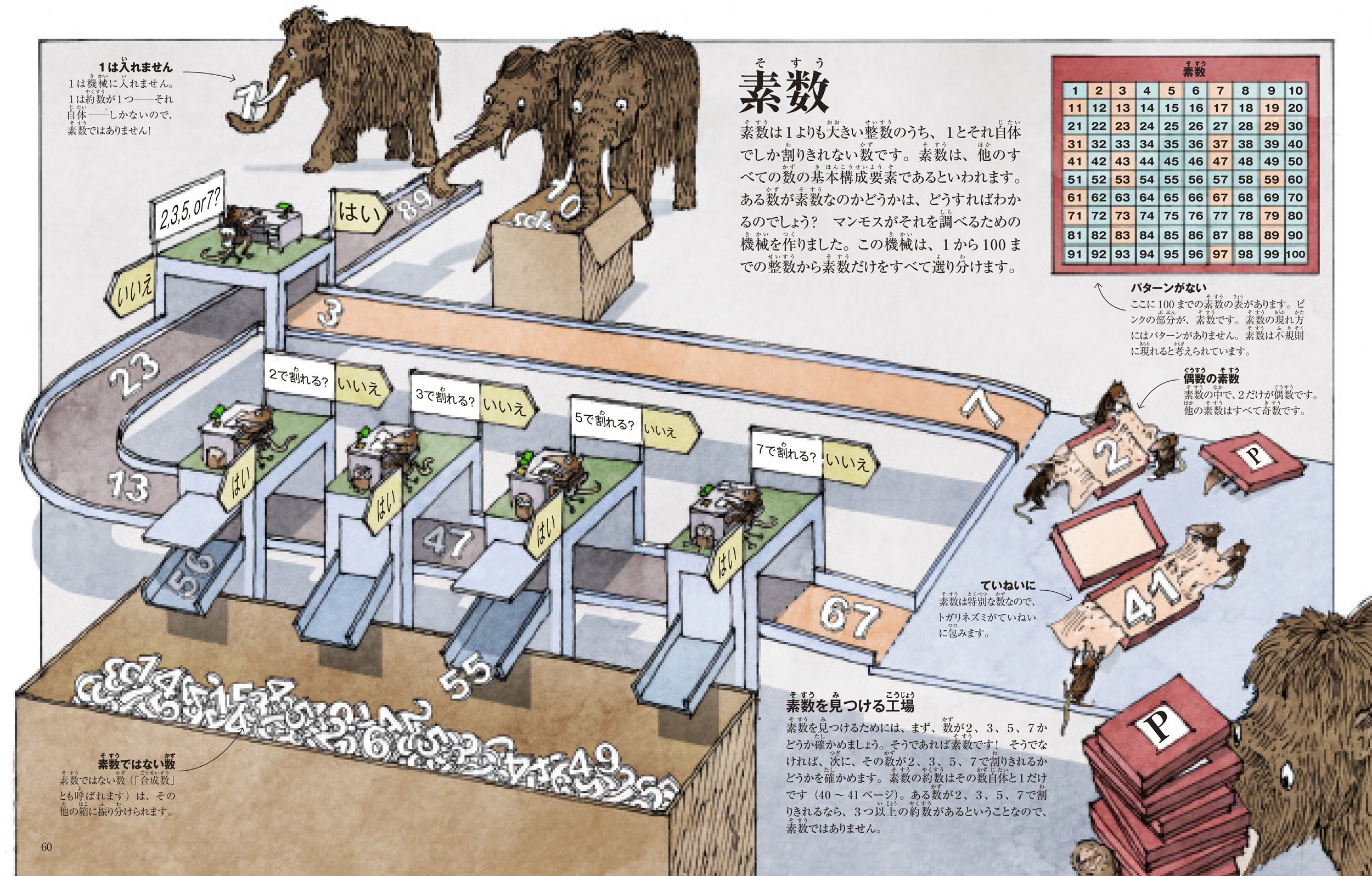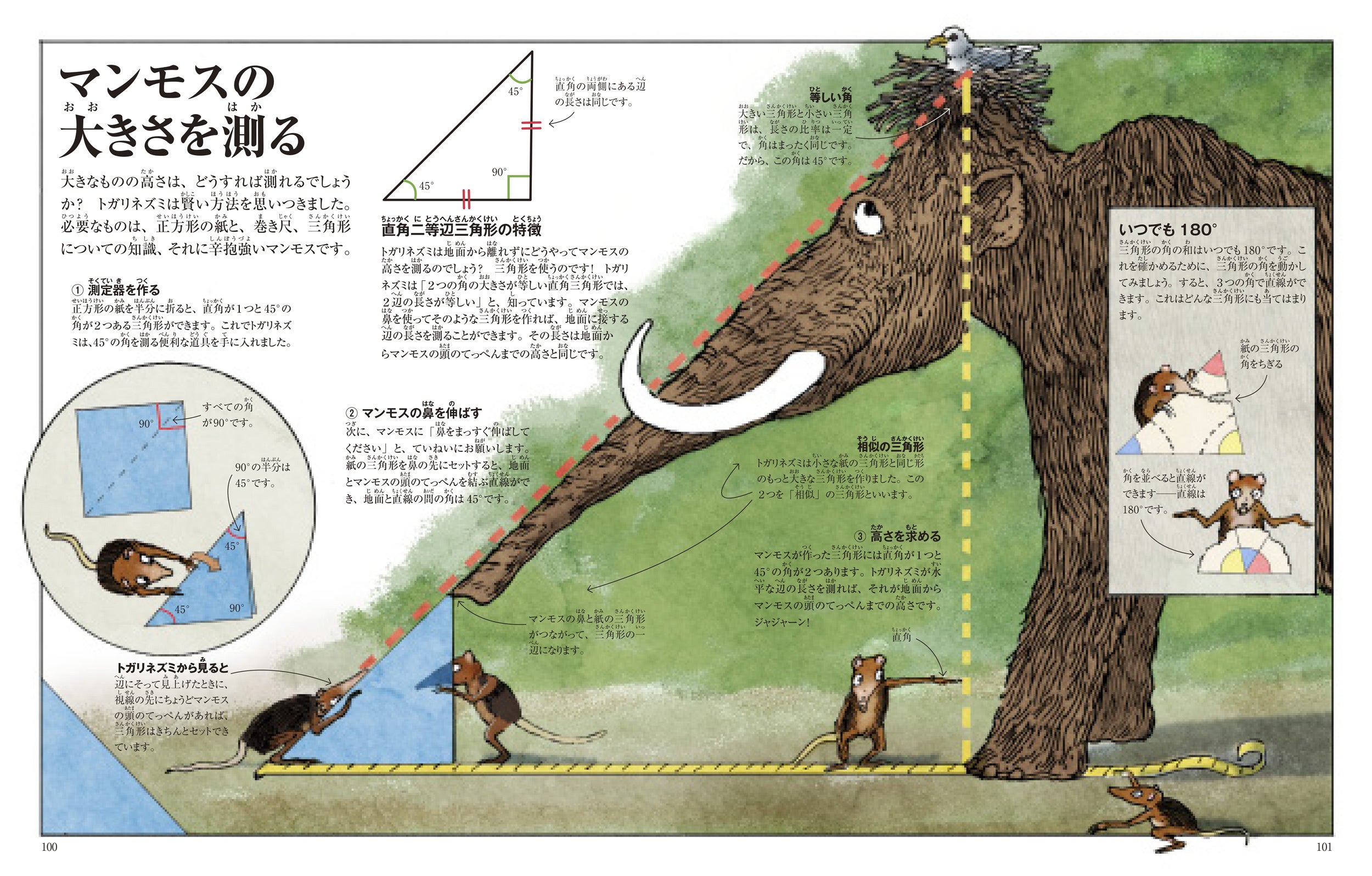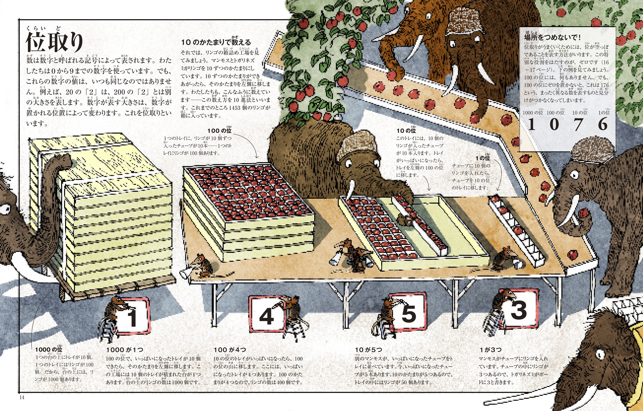 足し算、掛け算、約数、分数、比率、面積、体積、角度、数列、速さ、質量、確率...、言葉や数式だけではなかなか納得できなかった算数の基本概念が、あの世界中から愛される分かりやすいイラストによって、子どもも大人も目からウロコが落ちるように見えてきます。