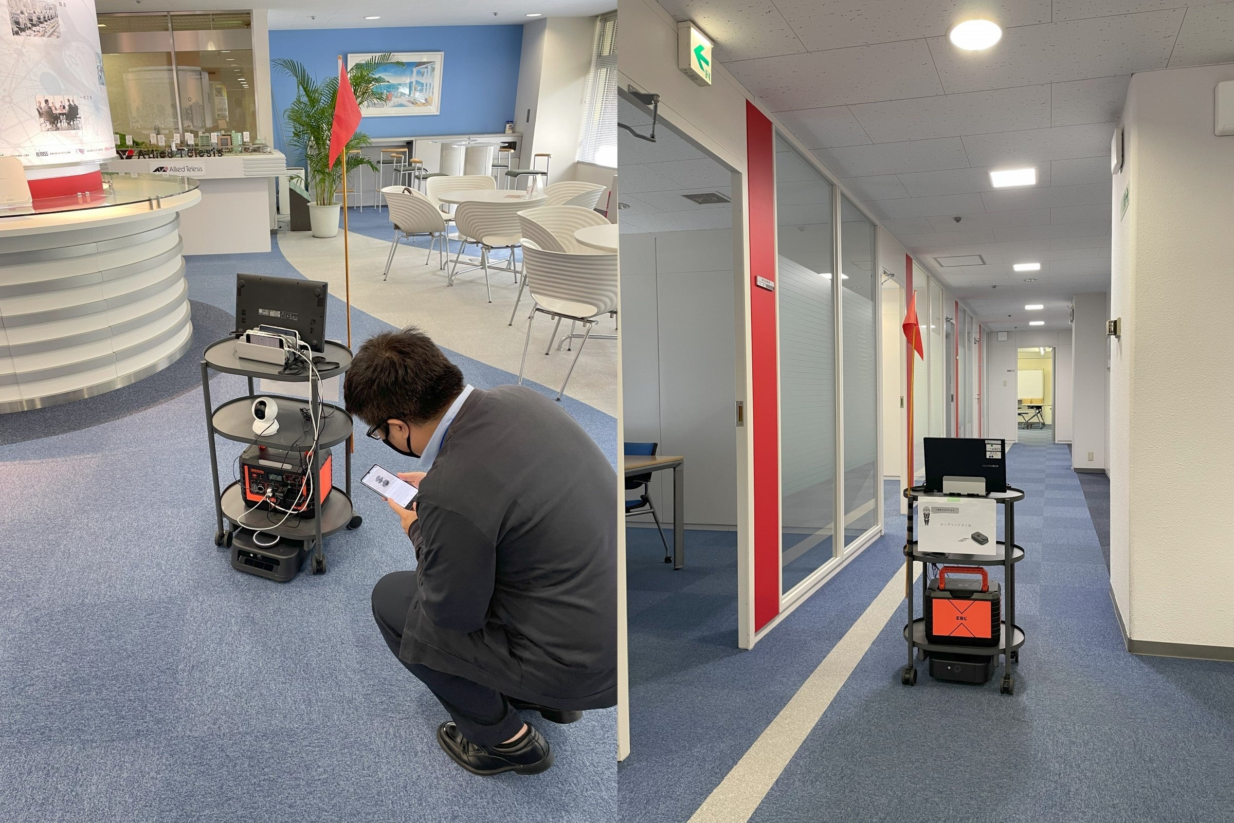 アライドテレシス独自の無線LAN技術「チャンネルブラケット」は、端末を移動しても通信が途切れないことが特長で、カチャカはその品質を検証するために導入しました。これまではスタッフが端末を持って、社内を歩き回りながら検証していたところ、なかなか想定した成果が挙げられませんでした。レストランでよく見る配膳ロボットの活用も考えましたが、価格が1台300万円ほどと高額なため断念。そんな中、たまたまテレビの情報番組でカチャカの性能と価格を知り、展示販売されているお店に伺って詳細を確認しました。