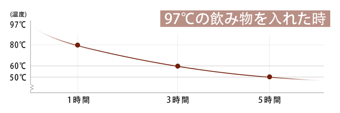 保温効力とは室温26℃±2℃において本体容器に熱湯をふた下端まで満たし、縦置きにした状態で湯温97℃±1℃の時から1/3/5時間放置した場合におけるその水の温度です。