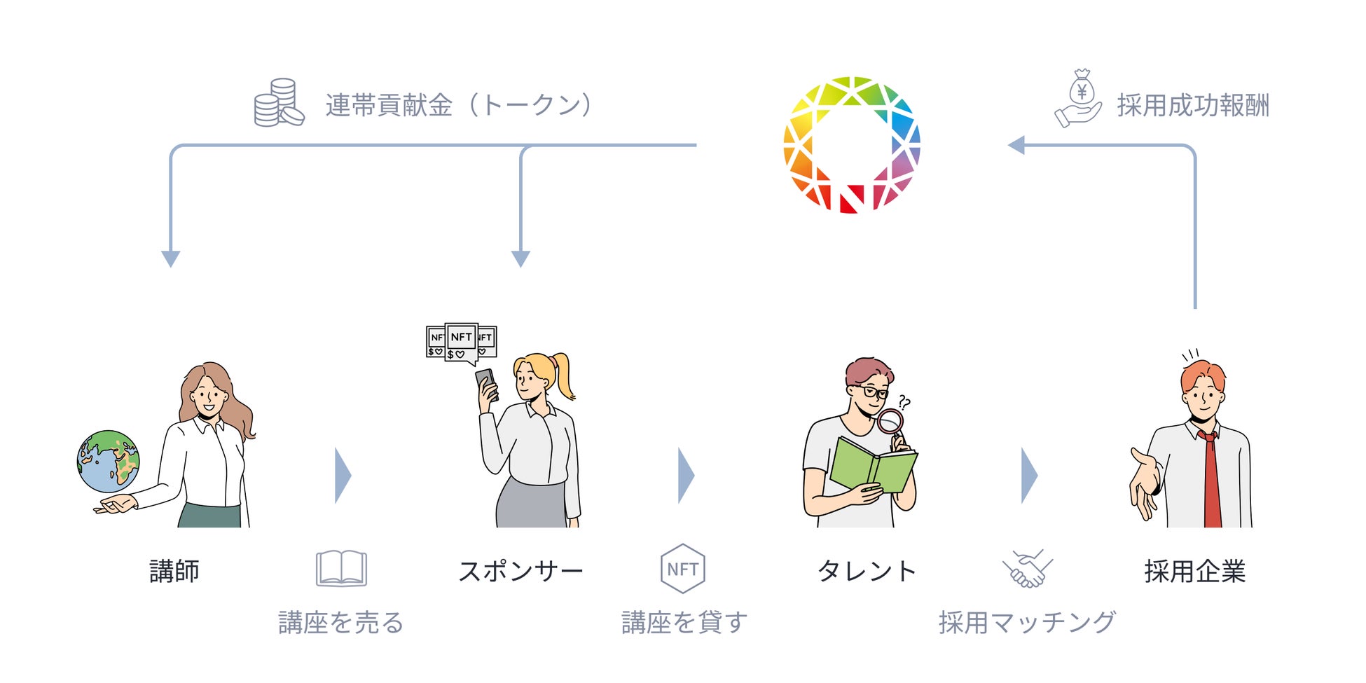 ONGAESHIは、NFTやブロックチェーン技術を活用して、「学びのスポンサー」が購入した「学ぶ権利(受講権)」を、学びたい人「タレント」に貸すことで、無償の学びと転職を支援する仕組みです。タレントが学んで転職すると、学びのスポンサーや講座提供者などに、人材育成の貢献の返礼として連帯貢献金(トークン)が贈られます。