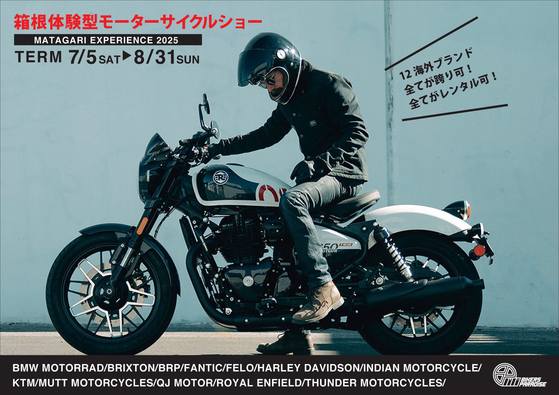バイカーズパラダイス南箱根の大人気企画、全ての展示バイクが跨り可能な 「MATAGARI EXPERIENCE」。2025年はマタガルだけではなく、何と1時間3,300円(税込)でレンタルして箱根を周遊することも可能に! しかも今年は、12海外ブランドの協賛で、話題のニューモデルが勢揃い。