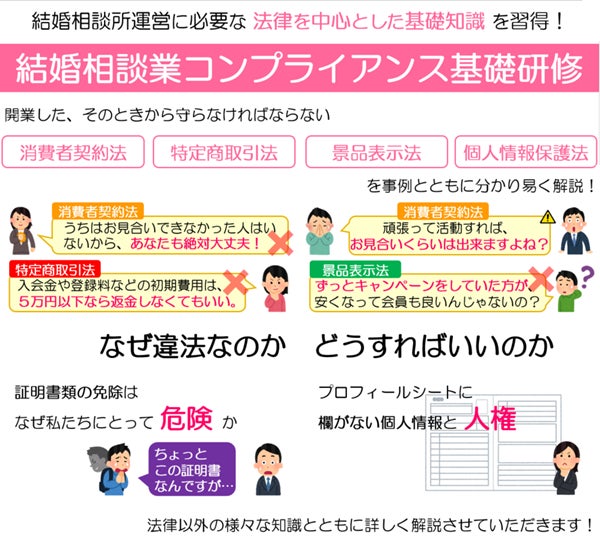結婚相談業の運営に必須の4つの法律。特定商取引法・消費者契約法・個人情報保護法・景品表示法の基礎を習得!「結婚相談業コンプライアンス基礎研修」!令和6年の9月から12月までの開催日程が決まりました!
