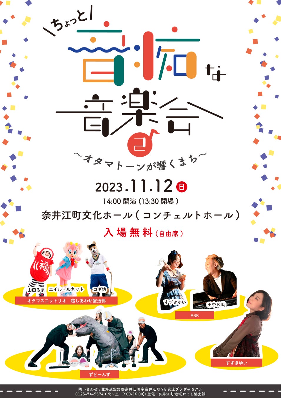 奈井江町は、「まち中(じゅう)音楽」を合言葉に、まちのあちこちで気軽に音楽や音に触れ、繋がることができる「音楽のまち」のまちづくりを行っています。本公演は地域おこし協力隊が主催する「勝手に音楽の町化計画」第9弾となる音楽イベント。