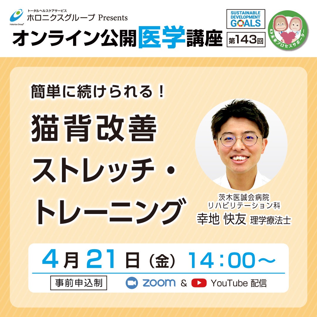 医療法人医誠会(大阪府大阪市 代表者: 谷幸治)では、第143回オンライン公開医学講座「猫背改善ストレッチ・トレーニング」を2023年4月21日(金)にオンラインで配信いたします。
