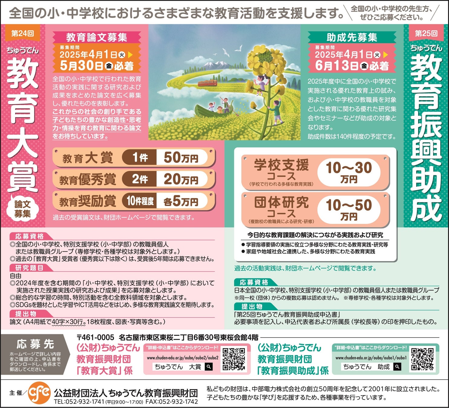 2025年4月1日より募集を開始する「第25回ちゅうでん教育振興助成(締切6/13)」および「第24回ちゅうでん教育大賞(論文)」(締切5/30)の応募概要を紹介します