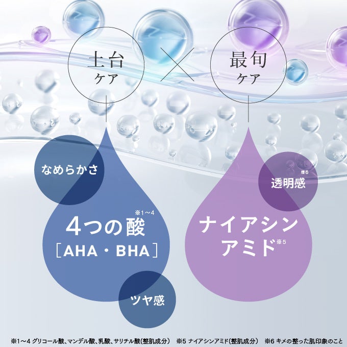 極力肌に刺激のないよう肌表面に働きかけるフルーツ酸の1種【AHA※2~4】と毛穴トラブルにアプローチする【BHA※5】、4種の酸をバランスよく配合しました。さらに、最旬成分【ナイアシンアミド※6】もプラスしました。