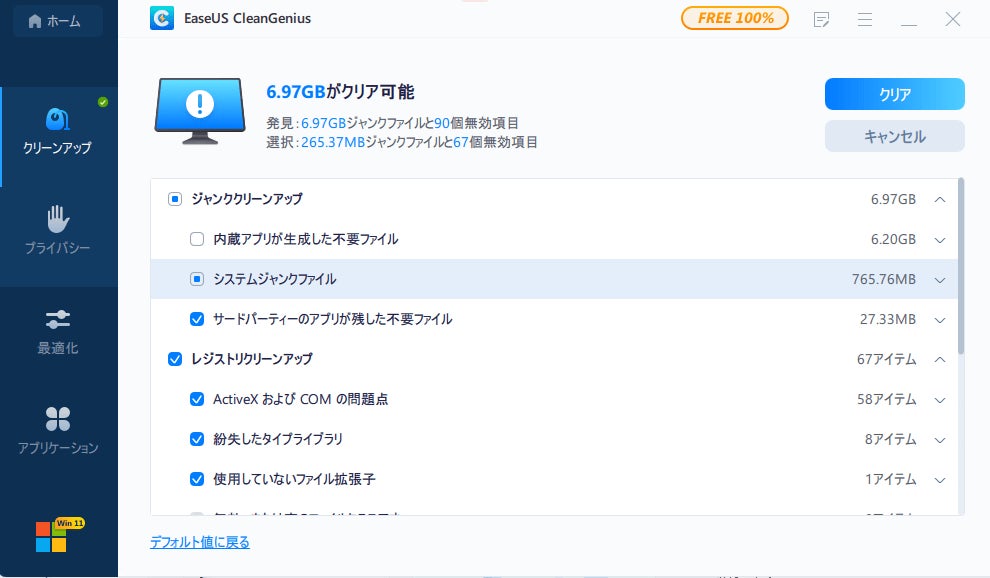 ステップ3:スキャンしたファイルから、不要なものを選び取り、「クリア」をクリックし、削除すればいいです。