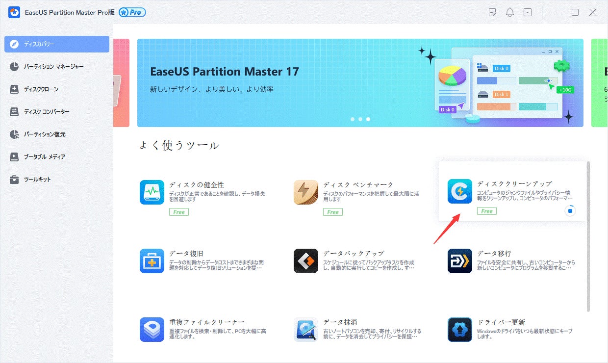 ステップ1:EaseUS Partition Master (https://bit.ly/3JMH2tS)をインストールし、立ち上げた後、「ディスカバリー」で「ディスククリーンアップ」を選択します。