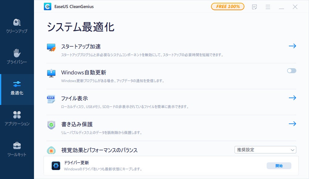 EaseUS CleanGenius for Windowsは、遅くなってしまったWindows PCの速度を回復し、確実に作動させるためのオールインワンのメンテナンスソフトです。わずか1分間でPCのスピード向上、クリーンアップ、ディスク容量の解放などの最適化を実現します。2023年3月13日に、EaseUS CleanGenius for Windows は Ver.3.0.1 にアップデートいたしました。今回の新バージョンでは、より簡単にPCを管理できるよう、ユーザーインターフェイスを最適化しました。