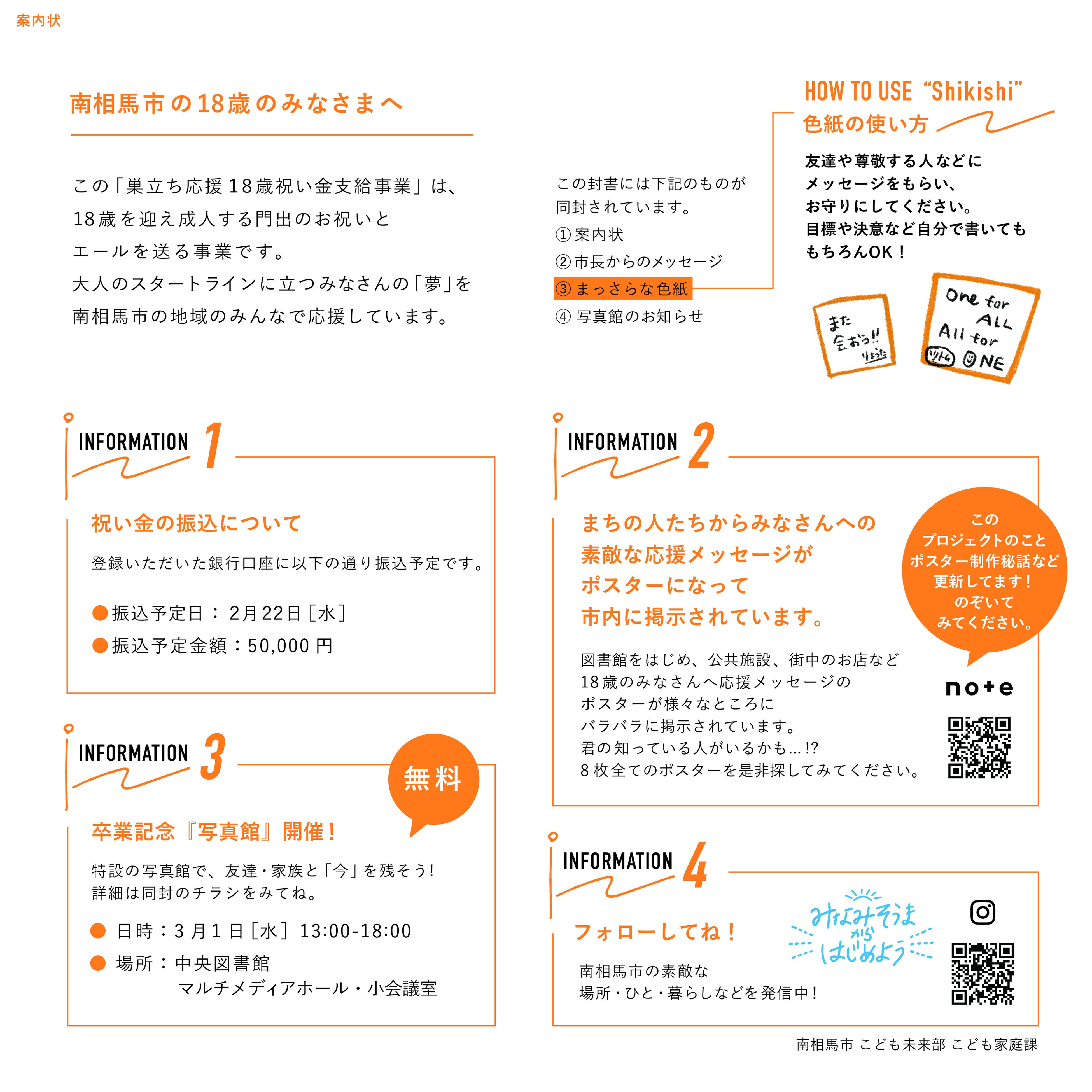 令和4年度より18歳を迎え成人し、大人のスタートラインに立つ若者の門出をお祝いする事業において、単にお祝い金を支給するだけでなく、1人1人に18歳の巣立ちを地域みんなで応援していることを伝えるため、自治体”らしくない”イベントの招待状のようなDMを演出。受け取った18歳や家族からも好評で、「思わず手に取ってみたくなるお手紙だった」と喜びの声が寄せられました。